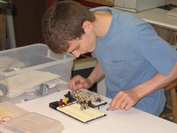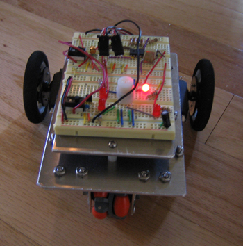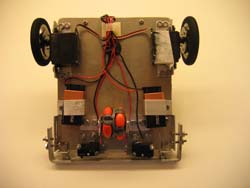 The robot uses a Dinsmore 1490 digital compass with outputs of active lows that permit LEDs to light and to drive a PIC microcontroller. Depending upon which of the pins are lows, the program reacts to turn servo motors. The servos are "hacked" so they will turn endlessly rather than stopping at a fixed point. The compass car won first place at the 2007 Florida TSA conference on April 20, 2007 and was a finalist at nationals in June, 2007.