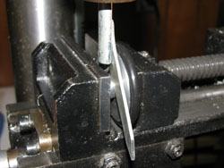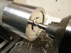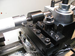 Step 7: Set-up toolpost with parting tool to cut shaft notch. Cut notch in 3 steps. Leave a little extra width of the flat outer surface to the left of the groove when cutting the notch.
