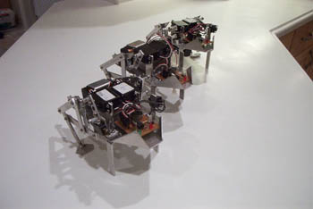This was our second year project for each student to build. It is an aluminum hopping robot that uses a 16F84A Pic microcontroller for servo control. We attempted to build six Frogbots and did not get one to function properly. The major problem was the instability because the body mass being too high. The Frogbot would hop one time then fall over. A much better project to learn microcontroller programming is Insectronics.