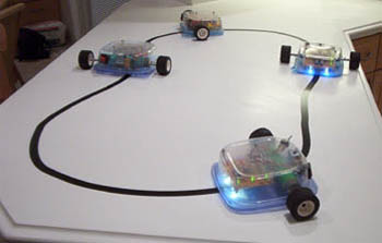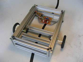Sandwich is the line-following robot detailed in David Cook's book, Robot Building for Beginners. The book and robot are great for the beginner classes since it goes into detail about each component that make up Sandwich. Each member in the beginner class builds their our individual Sandwich for the hands-on experience of working with electronics breadboards and shop tools. The electronics can be adopted to a larger frame made of 80/20 aluminum extrusions as seen below. One student built a six-wheeled vehicle using the same electronics circuit.